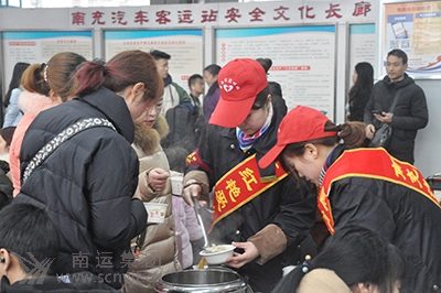 頭戴“小紅帽”、身佩大紅綬帶的匡紅艷愛心班的站務(wù)人員,不停地穿行在售票廳、候車廳。有引導(dǎo)旅客購票上車的導(dǎo)乘人員,有在愛心驛站為旅客不厭其煩耐心解答的咨詢?nèi)藛T,有在車站候車廳為旅客送鮮開水的服務(wù)人員,有滿腔熱情地扶老攜幼的青年志愿者。一位帥哥焦急地問“小紅帽”站務(wù)人員:“手機(jī)沒電了,哪里可以充電?”“小紅帽”站務(wù)人員一邊手指著右邊的“手機(jī)臨時充電處”,一邊熱情地說:“那里可以免費(fèi)充電!”帥哥說:“謝謝!”上午9點(diǎn)多鐘,“小紅帽”站務(wù)人員又為一早從鄉(xiāng)村來南充乘車的農(nóng)民工兄弟姐妹們送來了一碗又一碗的熱氣騰騰的“愛心餃子”,候車廳沸騰了起來,有的農(nóng)民工說:“太謝謝了!”有的旅客說“太周到了!”有的年輕小伙子和靚妹興致勃勃地拿起手機(jī)拍下了這一溫馨的時刻,為南充汽車客運(yùn)站點(diǎn)贊!