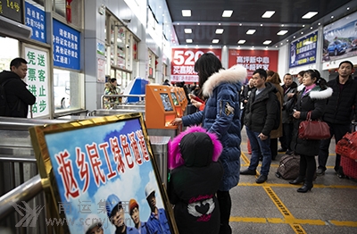 售票大廳里旅客購票秩序井然。7個售票窗口排著購票的旅客隊(duì)伍。車站網(wǎng)上購票的旅客已增加到約占一半。在四川汽車票務(wù)網(wǎng)兩名工作人員和1名“小紅帽”站務(wù)人員的引導(dǎo)下,絡(luò)繹不絕的旅客在10臺自助(售)取票機(jī)前便捷的。ㄙ彛┢。為了方便農(nóng)民工回家返崗,車站專門設(shè)置了農(nóng)民工服務(wù)臺,農(nóng)民工優(yōu)先售票窗口,農(nóng)民工檢票進(jìn)站綠色通道,車站工作人員熱情為農(nóng)民工提供指路、購票、咨詢、搬運(yùn)行李、維護(hù)秩序等服務(wù),深受農(nóng)民工歡迎。