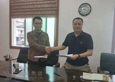 南運(yùn)集團(tuán)副總經(jīng)理兼南充新思維職業(yè)技能培訓(xùn)學(xué)校經(jīng)理鄧勇(右)與南充志立欽云科技服務(wù)有限公司總經(jīng)理鐘準(zhǔn)(左)簽約后相互熱情握手致賀。