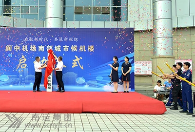 閬中古城機(jī)場黨委書記、董事長李廣平(左)與南運集團(tuán)南部分公司經(jīng)理周全(右)為設(shè)在南部汽車客運站的閬中古城機(jī)場南部城市候機(jī)樓揭牌。