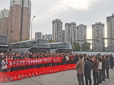 2月26日(農(nóng)歷正月初十),閬中市農(nóng)民工安全有序返崗“春風(fēng)服務(wù)”啟動(dòng)儀式在閬中客運(yùn)中心舉行。 啟動(dòng)儀式現(xiàn)場,南運(yùn)集團(tuán)閬中分公司選派的川R65363、川R65361、川R72899號等3輛54座豪華大巴客車載著156名農(nóng)民工,即將奔赴廣東中山、東莞等地,預(yù)計(jì)車程20余小時(shí),為返崗農(nóng)民工提供“點(diǎn)對點(diǎn)、一站式”直達(dá)運(yùn)輸服務(wù),讓他們“出門進(jìn)車門、下車進(jìn)廠門”。豪華大巴客車干凈整齊地停放一排,駕駛員和農(nóng)民工手拉“閬中市農(nóng)民工安全有序返崗‘春風(fēng)服務(wù)’啟動(dòng)儀式”紅底白字橫幅一字排開。 上午9點(diǎn),啟動(dòng)儀式由閬中市農(nóng)民工服務(wù)中心主任蒲仲秋主持,閬中市道路運(yùn)輸管理局局長曹雷對“春風(fēng)服務(wù)”作安排,南運(yùn)集團(tuán)閬中分公司黨總支書記、經(jīng)理、閬中客運(yùn)中心站長李曉全作表態(tài)發(fā)言。閬中市交通運(yùn)輸局運(yùn)輸股股長繆祥、閬中市道路運(yùn)輸管理局工會(huì)主席程偉等相關(guān)負(fù)責(zé)人參加啟動(dòng)儀式。 為切實(shí)抓好農(nóng)民工運(yùn)輸保障服務(wù)工作,參加此次“春風(fēng)服務(wù)”的南運(yùn)集團(tuán)閬中分公司和閬中客運(yùn)中心,成立了“春風(fēng)服務(wù)”工作專班,提前召開專題會(huì)議作了詳細(xì)的安排布置;利用多種宣傳方式,積極營造春運(yùn)工作及“春風(fēng)服務(wù)”的濃厚氛圍;選派車輛技術(shù)狀況最好的豪華大巴,由思想政治素質(zhì)過硬、駕駛技術(shù)嫻熟的駕駛員執(zhí)行“春風(fēng)服務(wù)”運(yùn)輸保障任務(wù),并提前對車輛進(jìn)行了全面檢修和衛(wèi)生保潔;堅(jiān)持實(shí)名制售檢票;認(rèn)真做好“春風(fēng)服務(wù)”的系列服務(wù)保障工作。 客運(yùn)中心嚴(yán)格按照無關(guān)人員、無關(guān)車輛、違禁品不進(jìn)站的“三不進(jìn)站”要求,對旅客行包做到“逢包必檢、逢液必查、逢疑必查”,確保無違禁物品進(jìn)入車站。來到候車廳檢票處,農(nóng)民工朋友們秩序井然地依次排隊(duì),耐心等待著車站的檢票,工作人員不斷提醒大家:“請出示您的身份證和車票,檢票完畢后,即可登車……”進(jìn)入發(fā)車站臺,所有農(nóng)民工朋友上車前,按照目的地進(jìn)行集中編組乘車,直接送達(dá)指定站點(diǎn),中途不再換乘其他車輛,大大提高了返崗效率,F(xiàn)場工作人員不遺余力地提供熱情周到的服務(wù),引導(dǎo)農(nóng)民工朋友上車、安頓行李,并分發(fā)含有方便面、面包、礦泉水等的貼心“暖意禮包”,確保他們的旅途溫馨舒適。同時(shí),返崗專車上還選了2名農(nóng)民工代表為車長和副車長,負(fù)責(zé)沿途乘客途中休息、集中餐食時(shí)的管理,確保安全有序返崗。 隨著一聲“啟程!”承載著“春風(fēng)服務(wù)”的農(nóng)民工返崗專車緩緩駛出閬中客運(yùn)中心,這些閬中籍的農(nóng)民工兄弟姐妹們滿懷對新年的憧憬與夢想,踏上了遠(yuǎn)赴千里的旅程,追尋新一年的財(cái)富與希望。在此祝愿他們一路順風(fēng)、健康平安、工作順利、馬年大吉。 返崗的農(nóng)民工朋友們紛紛表示:“每年的‘春風(fēng)服務(wù)’讓我們感覺很溫暖,還給我們發(fā)了慰問品,感謝黨和政府,感謝南運(yùn)集團(tuán),考慮得很周到,服務(wù)得很到位!薄拔覀兠磕甓荚陂佒锌瓦\(yùn)中心乘坐‘春風(fēng)服務(wù)’返崗專車外出務(wù)工,中途不用轉(zhuǎn)車直達(dá)工廠,十分方便,值得點(diǎn)贊!” 據(jù)了解,此次“春風(fēng)服務(wù)”將持續(xù)到3月13日春運(yùn)結(jié)束。開展“春風(fēng)服務(wù)”,南運(yùn)集團(tuán)不僅有效解決了外出務(wù)工人員的交通出行問題,也為廣大務(wù)工人員提供了良好的文明運(yùn)輸服務(wù),使他們的旅途平安便捷溫馨。 (閬中分公司 茍興權(quán))
