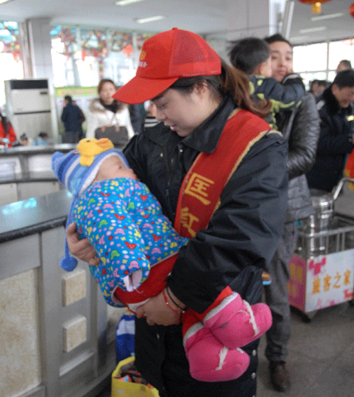 頭戴“小紅帽”的“匡紅艷愛心班”的站務(wù)人員,身佩大紅授帶,不斷地穿行在售票廳、候車廳。有為購票旅客解答疑難的導(dǎo)乘人員,有在咨詢處為旅客不厭其煩耐心解答的咨詢?nèi)藛T,有在車站候車廳為旅客送鮮開水的服務(wù)人員,還有嘉陵區(qū)團(tuán)委安排的4名青年志愿者,他們滿腔熱情地扶老攜幼,在行包安檢后幫提行李,讓旅客順利的登上返程班車。一位獨(dú)自一人去墊江的女乘客放心的將自己不到一歲的小寶寶遞交給“小紅帽”站務(wù)人員抱著,以便自己入廁,當(dāng)又抱回自己的小寶寶后,非常感謝“小紅帽”的幫助。
