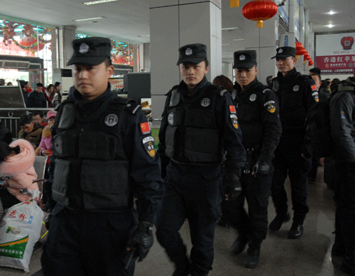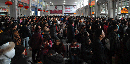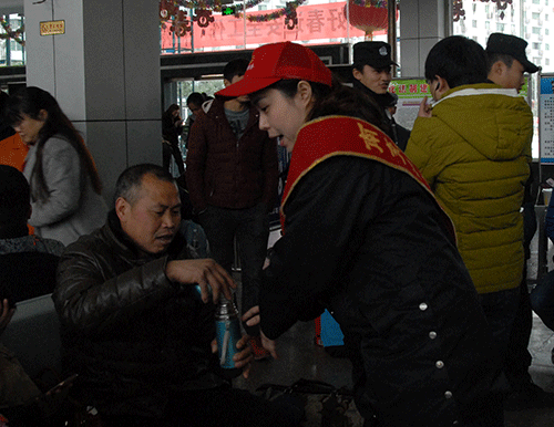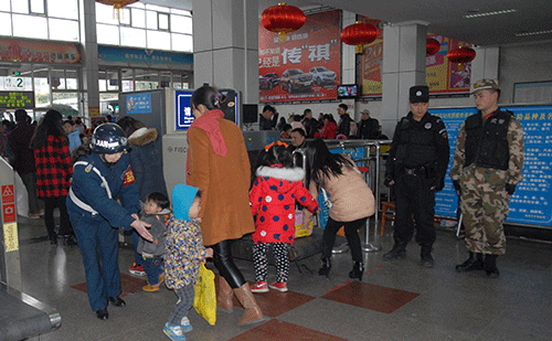 中午1點(diǎn)多鐘,由于成南高速公路私家小車流量增大,嚴(yán)重堵車,造成加班車輛不能及時返回車站,致使到成都的旅客排著兩列隊伍從候車廳8號檢票口一直延伸到5號檢票口對面的候車廳內(nèi)。但一直沒有看見到成都排隊上車的隊伍延伸到候車廳外,象往年那樣在站前廣場蜿蜒曲折“山路十八彎”的情景了。懸掛著12個大紅燈籠的整個候車大廳里旅客十分擁擠,人滿為患,卻暖意融融。車站派出所所長楊宗明帶領(lǐng)6名公安干警和嘉陵區(qū)公安分局的8名特警來回巡邏執(zhí)勤,反恐防暴,高度警惕地維護(hù)著檢票上車和旅客候車秩序。