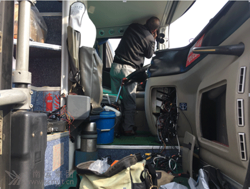圖為安裝人員正在對衛(wèi)星定位車載視頻監(jiān)控系統(tǒng)進行安裝