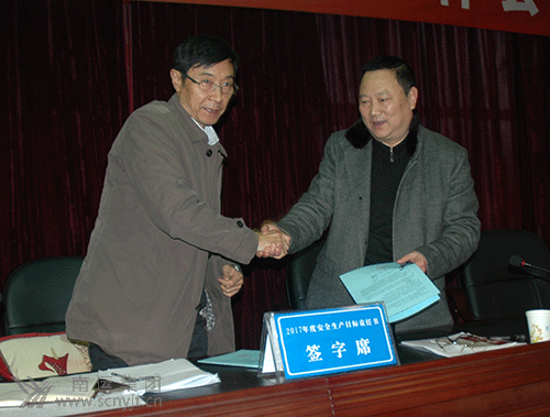 王董事長(zhǎng)與南部分公司經(jīng)理柴俊躍簽訂《2017年度安全生產(chǎn)目標(biāo)管理責(zé)任書(shū)》后親切握手。