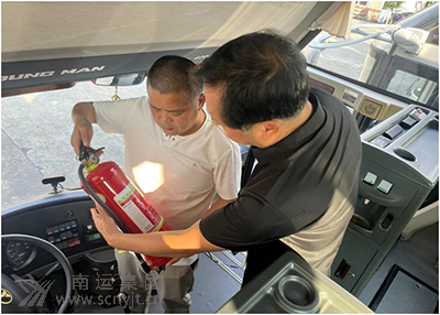 高速客運分公司安全生產第一責任人岳軍帶隊檢查車輛發(fā)動機及隨車滅火器