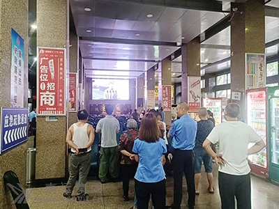 南充市城北汽車客運(yùn)站候車室LED顯示屏播放大會(huì)現(xiàn)場(chǎng)直播,吸引旅客駐足觀看。