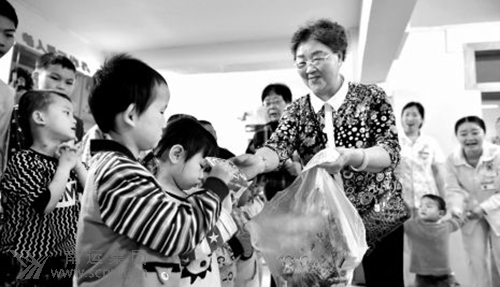 5月26日下午,南運集團“愛心婆婆”葉千秀帶著禮物,來到市兒童福利院,提前陪孩子們過“六一”。今年,是葉婆婆陪孩子們過的第十個兒童節(jié)。 “葉婆婆,謝謝你來看我們!笨吹饺~千秀,孩子們高興不已,圍在葉千秀的身邊,親切地向她問好!皝恚⒆觽,這是我給你們的節(jié)日禮物,祝你們節(jié)日快樂。”葉千秀拿出餅干、糖果,一 一分發(fā)給孩子們。隨后,葉千秀又拿出2000元現(xiàn)金,交給福利院工作人員,叮囑工作人員給孩子們買點他們喜歡的玩具。 葉千秀是南運集團一名普通的退休老人,她先后幫助26名大學生完成學業(yè),還資助了1名高中生,兩名初中生。兒童康復(fù)中心的孩子需要幫助,她慷慨解囊;老年合唱團沒活動經(jīng)費,她伸出捐助之手。從2007年開始,她每年都會到兒童福利院陪孩子們過節(jié)。16年來,她已捐出58萬元現(xiàn)金。 (摘自2016年5月27日《南充日報》第六版 記者 陸待君)