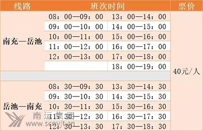 線路班次:南充-岳池每天11個班次,岳池-南充每天10個班次,具體時刻表如下:
