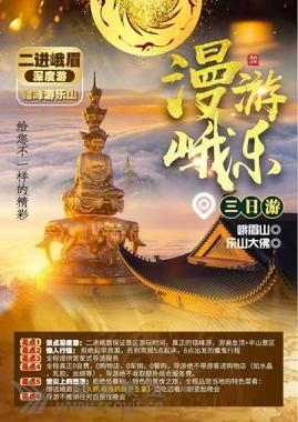 第一天:當?shù)?成都 宿:成都市區(qū)指定酒店 第二天:成都—峨眉山 宿:峨眉山半山 06:30成都三環(huán)內(nèi)接(到酒店接站時間預計提前1小時左右),07:30在成都市武侯區(qū)高朋東路附近集合出發(fā),上車后繼續(xù)小睡,經(jīng)過 2 小時30分后抵達佛國仙山峨眉山。 (溫馨提示:旺季因旅游人數(shù)較多,為避免您到達景區(qū)后耗時排隊過長,可能會提前出發(fā),請配合導游工作;具體集合時間和地點以導游通知為準!) 11:30萬年寺停車場午餐品嘗【地道峨樂小吃宴】以樂山峨眉山當?shù)卣诿〕詾橹鞯牟,包含西壩豆腐、甜皮鴨等?jīng)典特色美食 ,贈送嘉州豆腐腦+仙山凍粑。 后搭乘景區(qū)環(huán)保觀光車(觀光車費自理90/人)上山,前往雷洞坪。 13:30到達雷洞坪停車場,步行1.5公里到【接引殿】(途中會路過一個野生猴區(qū)分布地,可觀賞野生猴子,請注意在觀賞時不要靠太近,喂食等),乘索道【索道費用自理65/人】上【金頂】,朝拜【十方普賢圣像】,參觀金頂【華藏寺】和 “銀殿”【臥云庵】,天氣晴好時還可遙望遠方的貢嘎峰;游覽【金剛嘴】【舍身崖】等景點,運氣好時有幸遇到佛光。游完金頂后乘下行索道【索道費用自理55/人】按原路返回雷洞坪停車場。 16:30乘景區(qū)觀光車下山前往半山,入住酒店。 18:00品嘗當?shù)仞B(yǎng)生餐-【久養(yǎng).峨眉藥膳養(yǎng)生宴】,觀看匯集全川的民間藝術精品,彝族舞蹈,皮筋,吐火,魔術,舞蹈乖幺妹兒,讓此次旅行有顏有味。溫馨提示如果因特殊原因排隊堵車等等下山晚,表演取消,贈送項目無費用退。 峨眉山野生中藥材+生態(tài)跑山雞耗費5小時精心熬制鍋底。主菜:年份生態(tài)雞一只2.5斤、晶髈蹄名(肘子500g)、養(yǎng)生肉丸(10個)、精品五花肉(250g)、峨眉香酥(250g)、美好火腿(250g)、鵪鶉蛋1份、山藥1份、冬瓜1份、米粉1份、竹筍1份、泉水豆腐1份、青菜葉子2份、竹蓀1份、時素拼盤1份、面條1份、水果拼盤1份。 第三天: 峨眉山—樂山大佛—成都-當?shù)?/span> 06:30在酒店用早餐(或路早),辦理退房手續(xù)。 07:00餐后乘索道【索道費用自理65/人】上行至萬年索道站,步行至普賢菩薩道場---萬年寺,游覽被喻為“白水秋風”的【萬年寺】【萬年寺門票自理10元/人】,在寺內(nèi)參觀峨眉山鎮(zhèn)山之寶重達62噸的【普賢神像】,下行至白娘子修道成仙的【白龍洞】、【清音閣】、【清音平湖】、【黑龍江棧道】、【一線天】、【自然生態(tài)猴區(qū)】,后按原路返回到清音閣,然后至五顯崗。{黑龍江棧道、一線天、自然生態(tài)猴區(qū)因地理位置特殊屬于游客自行前往,導游不陪同,且此段行程視時間而定,如時間來不及可能放棄游覽} (溫馨提示:節(jié)假日或旅游旺季因旅游人數(shù)較多,為避免您到達景區(qū)后耗時排隊過長,可能會提前出發(fā),請配合導游工作;具體時間以導游通知為準) 12:30午餐安排品嘗當?shù)靥厣恕?/span> 14:30餐后乘車前往樂山。 前往樂山大佛景區(qū),登山觀看大彌勒坐佛—樂山大佛,樂山大佛修建于唐朝通高71米,親身體會“山是一尊佛,佛是一座山”的雄偉壯觀。溫馨提示:門票景區(qū)打包價 樂山免票退30元/人;1.16-12.14峨眉山免票退50元/人,半票退20元;12.15-次年1.15峨眉山免票退30元/人;樂山退30元/人,半票不退。 16:30乘旅游大巴車返回成都,回程會與其他團隊一起回成都,一人一座。預計18:30左右返回成都。 18:30左右到成都市武侯區(qū)高朋東路地鐵口附近統(tǒng)一散團,后乘車返回當?shù)兀ㄜ囐M已含)結束愉快美好的旅程。 溫馨提示: 用車:空調(diào)旅游車,確保一人一座;可提前升級保姆車。 門票:樂山大佛、峨眉山首道大門票,產(chǎn)生優(yōu)惠免票按旅行社景區(qū)協(xié)議價退款。 用餐:含1早3正(正餐10人一桌,不含酒水;菜品根據(jù)人數(shù)和季節(jié)會有所調(diào)整;不用餐不退費用) 酒店:峨眉山半山1晚住宿(參考酒店:凱優(yōu)威爾晚香樓/仙蹤林、迎客軒酒店,嘉友酒店、圣象大酒店、東輝大酒店、華英酒店、飛音閣酒店等)若產(chǎn)生單男單女或自然單間,我社有權安排三人間或客人自付單房差。 導游:全程一個導游服務,不換導游。 保險:旅游意外保險服務(不含景區(qū)猴區(qū)及索道保險,需要請在景區(qū)自購)。 咨詢報名熱線:0817-2247888 小李15984840777 小顧15882684881 小程15351260777 (高速客運分公司 朱玲)